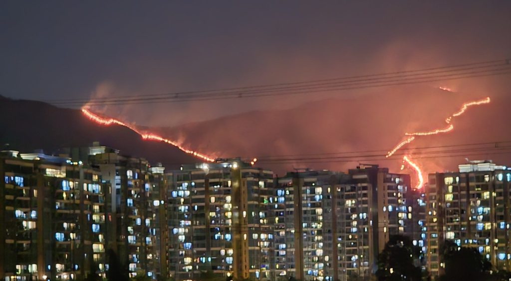 12th January 2025 – (Hong Kong) A massive hill fire continues to rage near the Kai Kung Leng area in Yuen Long, with firefighters struggling to extinguish the flames that have persisted for over ten hours. As of 4.10am today, two fire lines measuring 100 and 200 metres were clearly visible from Tai Mo Shan.