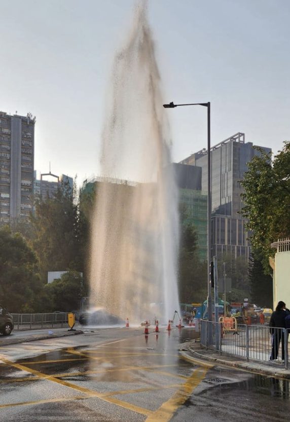 16th January 2025 – (Hong Kong) At around 5.06pm today, a major water main burst occurred on Kwai Fuk Road, near Shing Fuk Street, adjacent to a local school. Witnesses reported a dramatic water column exceeding ten metres, equivalent to five storeys, gushing from the ground, which caused minor disruptions to traffic as vehicles had to navigate through the flooded area.
