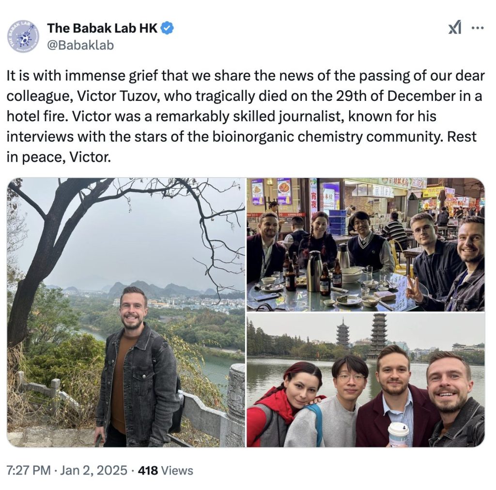 4th January 2025 – (Hong Kong) A devastating fire broke out at The Ember Hotel near Khaosan Road in Bangkok on the evening of 29th December, resulting in the tragic deaths of three foreign nationals and injuries to seven others. Among the deceased was Victor Tuzov, a Ukrainian PhD student from the Media and Communication department at City University of Hong Kong (CityU), as confirmed by the university’s research group, The Babak Lab, on 2nd January.