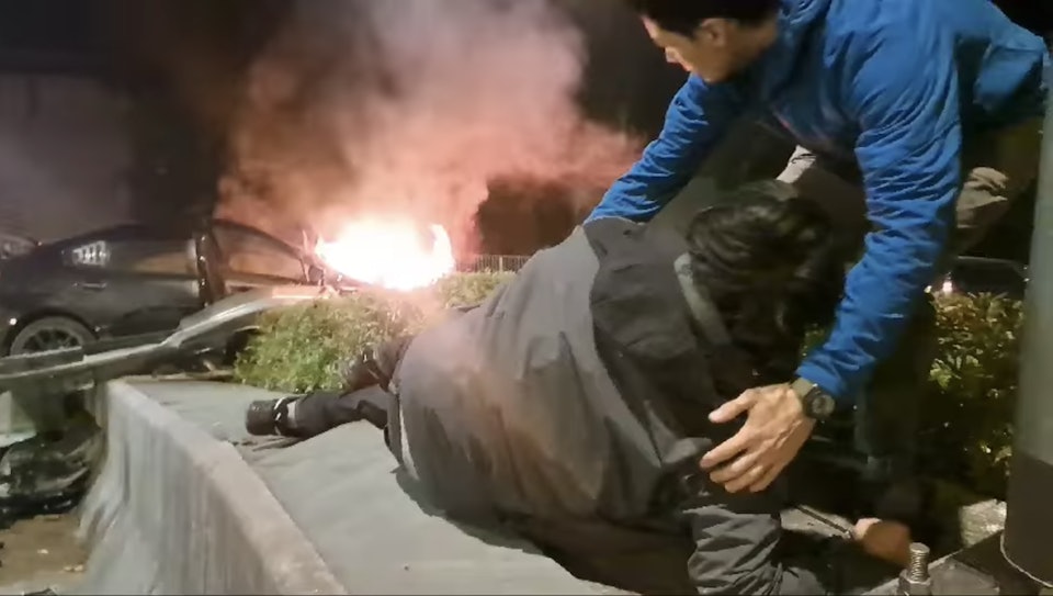 Firefighters arrived on the scene with firefighting equipment, and after approximately half an hour, they successfully extinguished the blaze. Footage from the incident showed the car’s airbags deploying, trapping the driver briefly in the driver’s seat, with blood visible on his face. Bystanders rushed to assist, shouting, “It’s on fire! Hurry out! Quickly!” The driver later stumbled from the vehicle and collapsed on the roadside, groaning in pain.