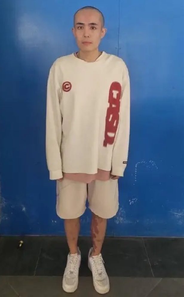 According to a photo shared on Weibo and relayed by Myanmar’s Yangon Khit Thit News Agency, his head was shaved, and red patches were visible on his left leg.