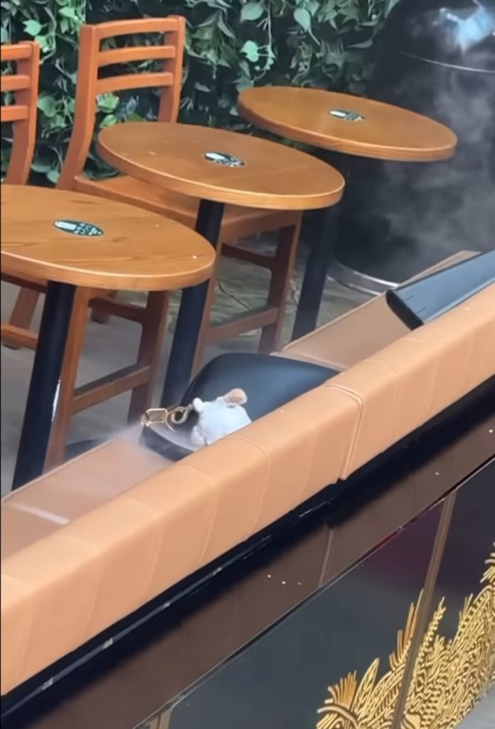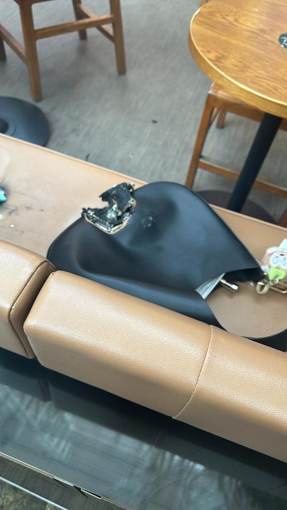 10th January 2025 – (Hong Kong) A video circulating online today shows a black handbag smoking and burning at the base while placed on a bench at the Starbucks located on the fourth floor of Langham Place, Mong Kok. The footage captures a male security officer swiftly using a fire extinguisher to douse the flames, successfully putting out the fire.
